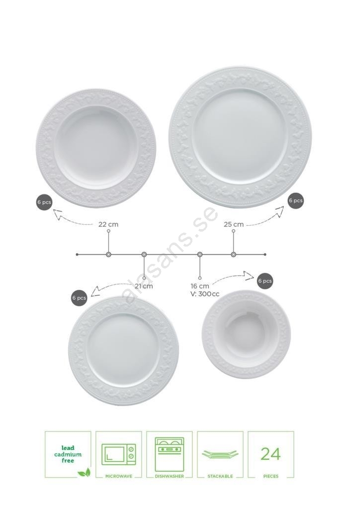 • Tallrik: 22 x 22 x 4 cm (6 st.).