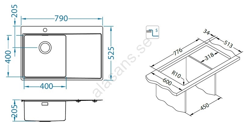 • ALVEUS 1149516 - Diskho PURE 79 x 52,5 cm satinborstad, högerutförande + vattenlås med snabbavstängning