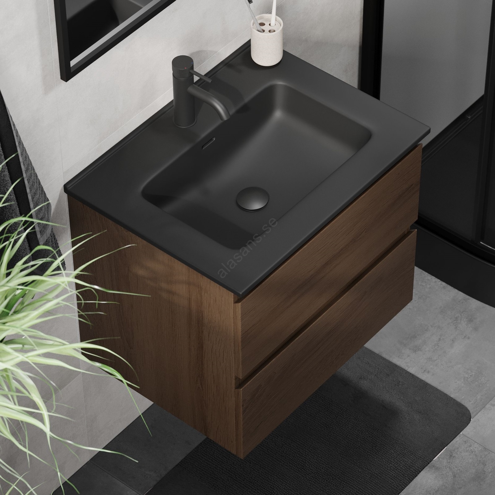 Badrumsskåp med tvättställ KENWOOD 61 cm valnöt/svart | Alasans