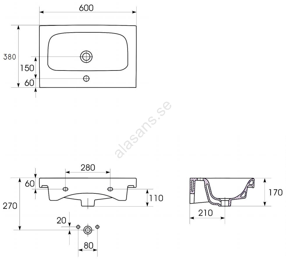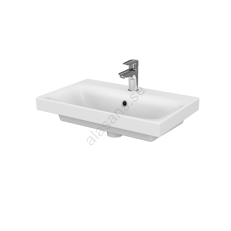 • Det keramiska tvättstället har en klassisk rektangulär form med hål för blandare och överfyllnadsskydd.
