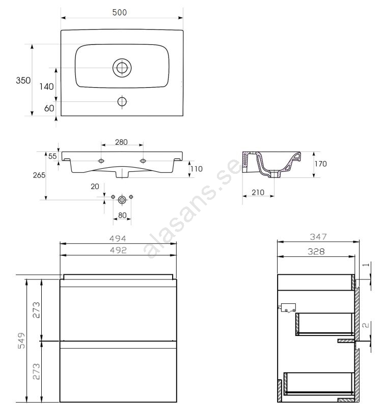 • Det keramiska tvättstället har en klassisk rektangulär form med hål för blandare och överfyllnadsskydd.