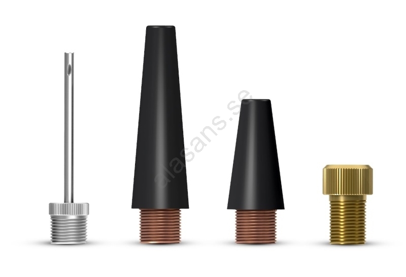 • 4 adaptrar i olika storlekar: adapter för Presta-ventil (Presta), nåladapter för bollar, kort konadapter, lång konadapter.