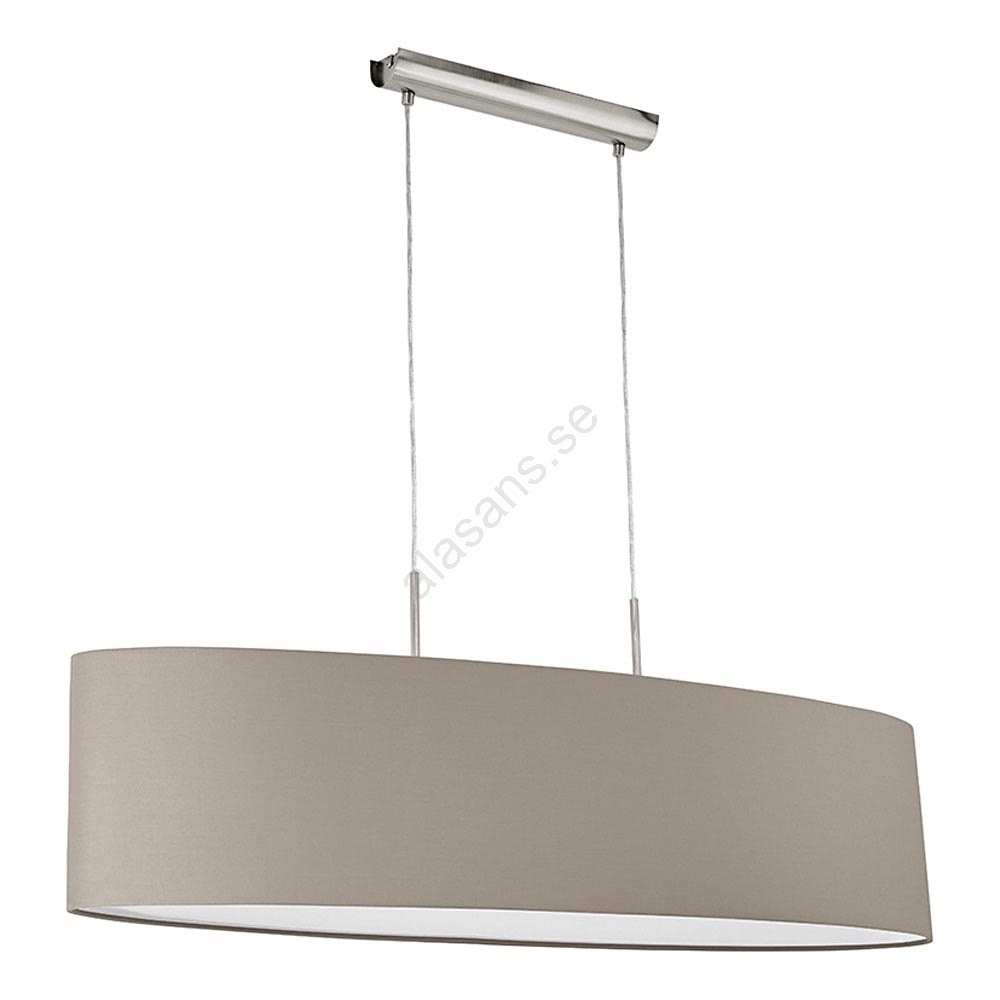 • Armaturens utseende förstärks av en oval lampskärm i gråbeige textil, kompletterad med en metallupphängning.
