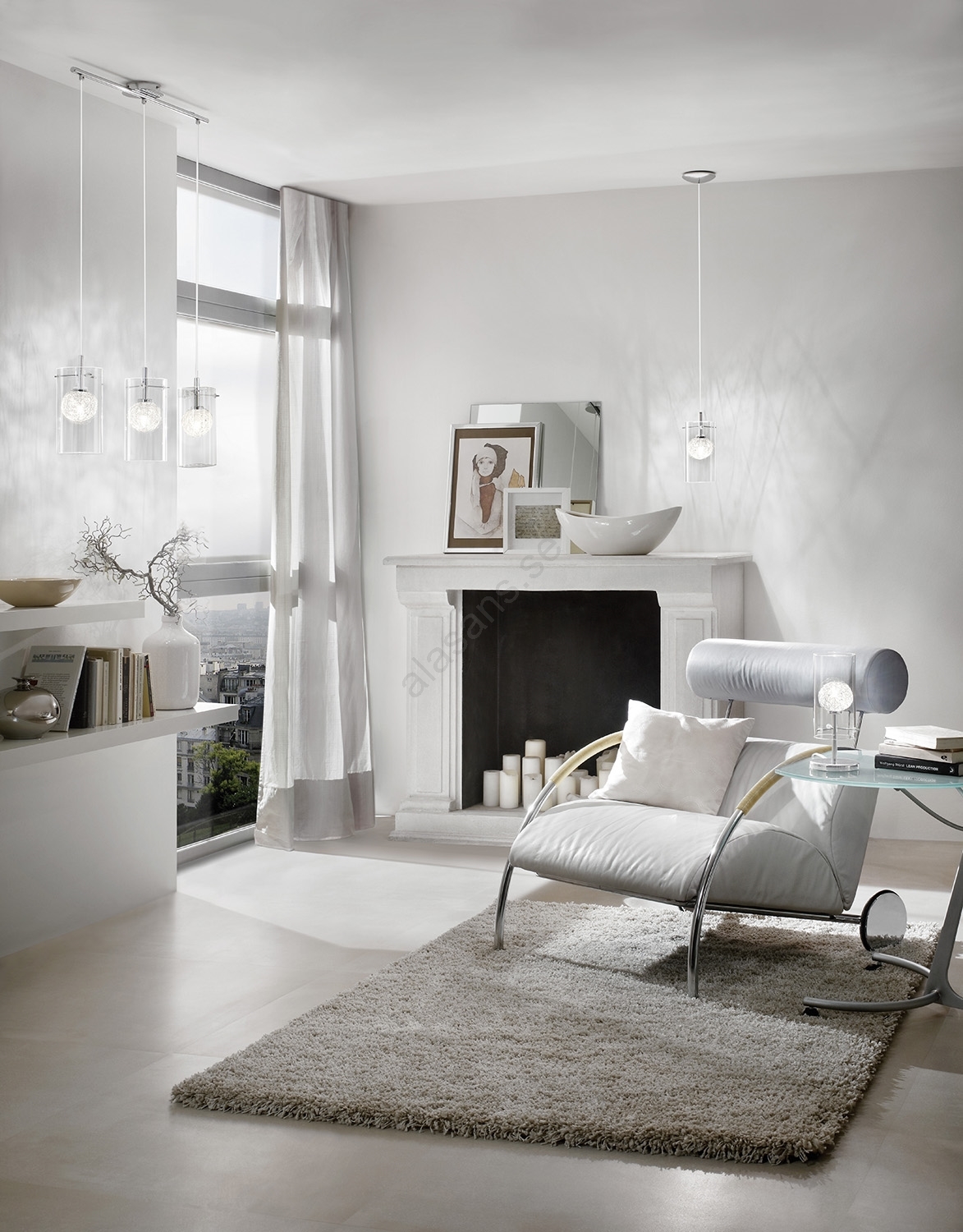 • Denna unika lampa är tillverkad i metall med en yta i blank krom och klart glas.