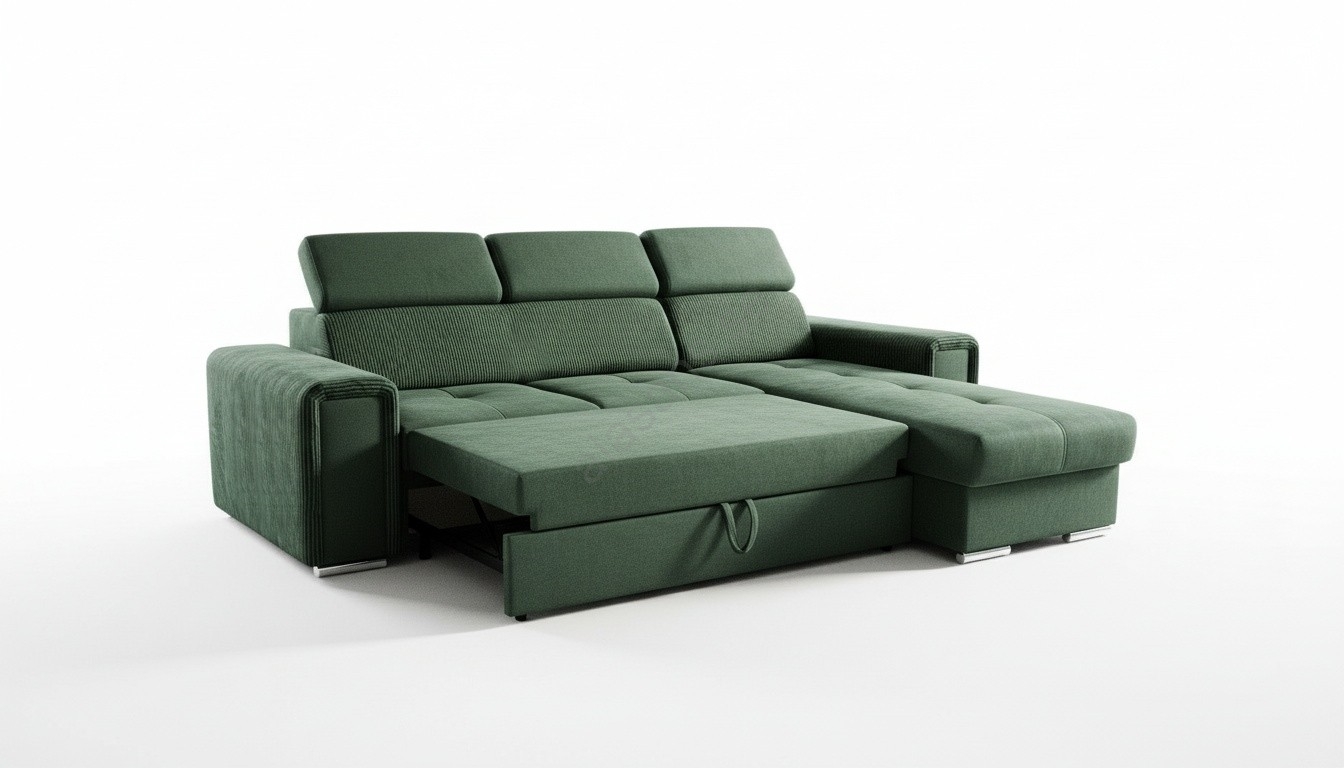 Mångsidig L-formad hörnsoffa med bäddfunktion och förvaringsutrymme SALVADA grön