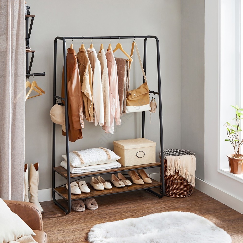 • Häng jackor, skjortor och byxor på den övre stången längs hela dess längd, förvara väskor, skor eller lådor på 2 förvaringshyllor och hattar, sjalar samt paraplyer kan hängas på sidorna.