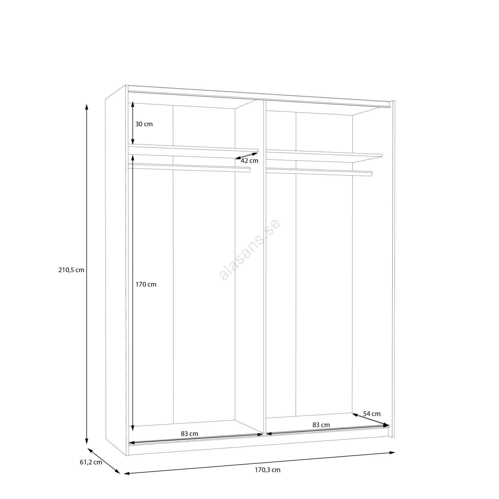 • Skåpet är utrustat med klädstänger, hyllor och ett rymligt förvaringsutrymme för dina kläder, väskor och säsongsartiklar.