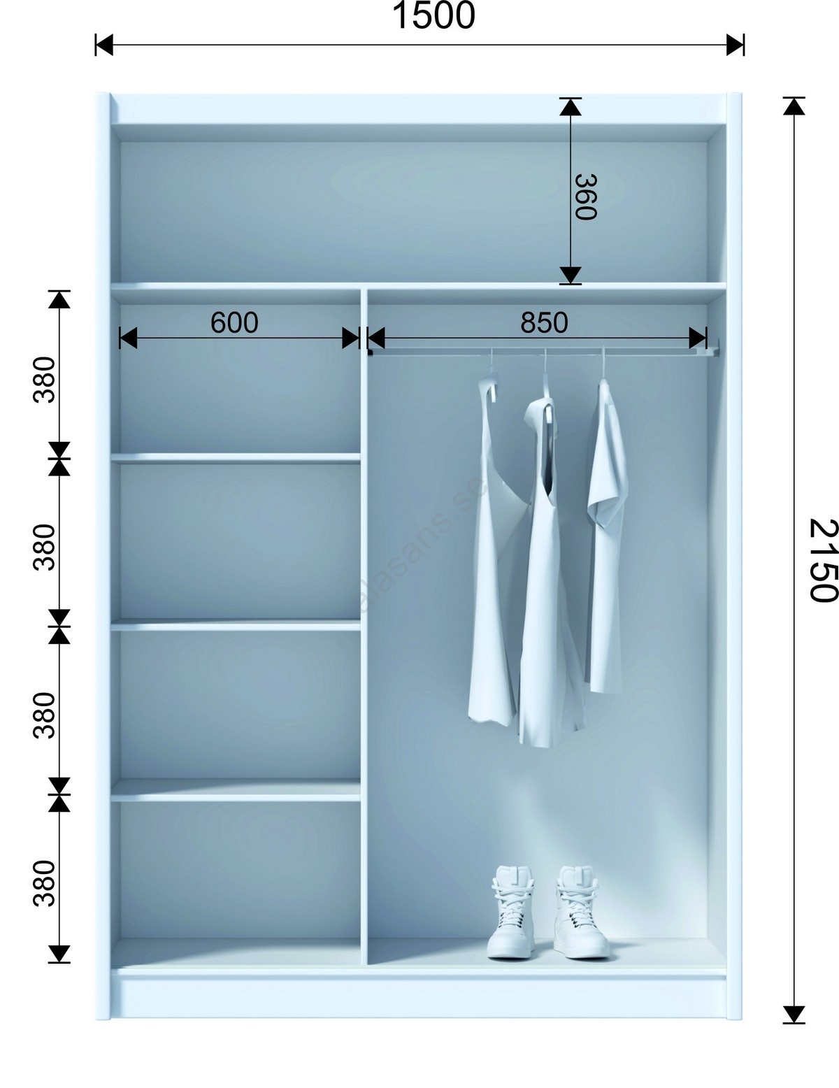 • Garderoben har 4 öppna hyllor, en klädstång och en övre hylla för förvaring av väskor och säsongsartiklar.