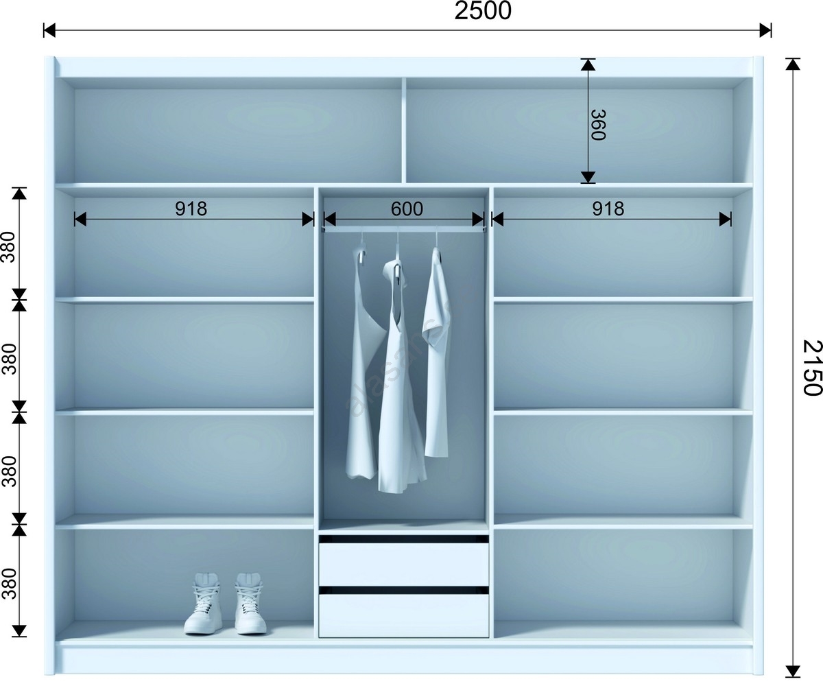 • Skåpet har 8 öppna hyllor, 2 lådor, en klädstång och 2 övre hyllor för förvaring av väskor och säsongsartiklar.