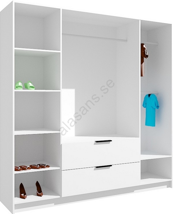 • Skåpet har 5 öppna hyllor på vänster sida, 1 stor hylla i mitten med en klädstång, 2 på höger sida samt 2 lådor för förvaring av väskor och säsongsartiklar.