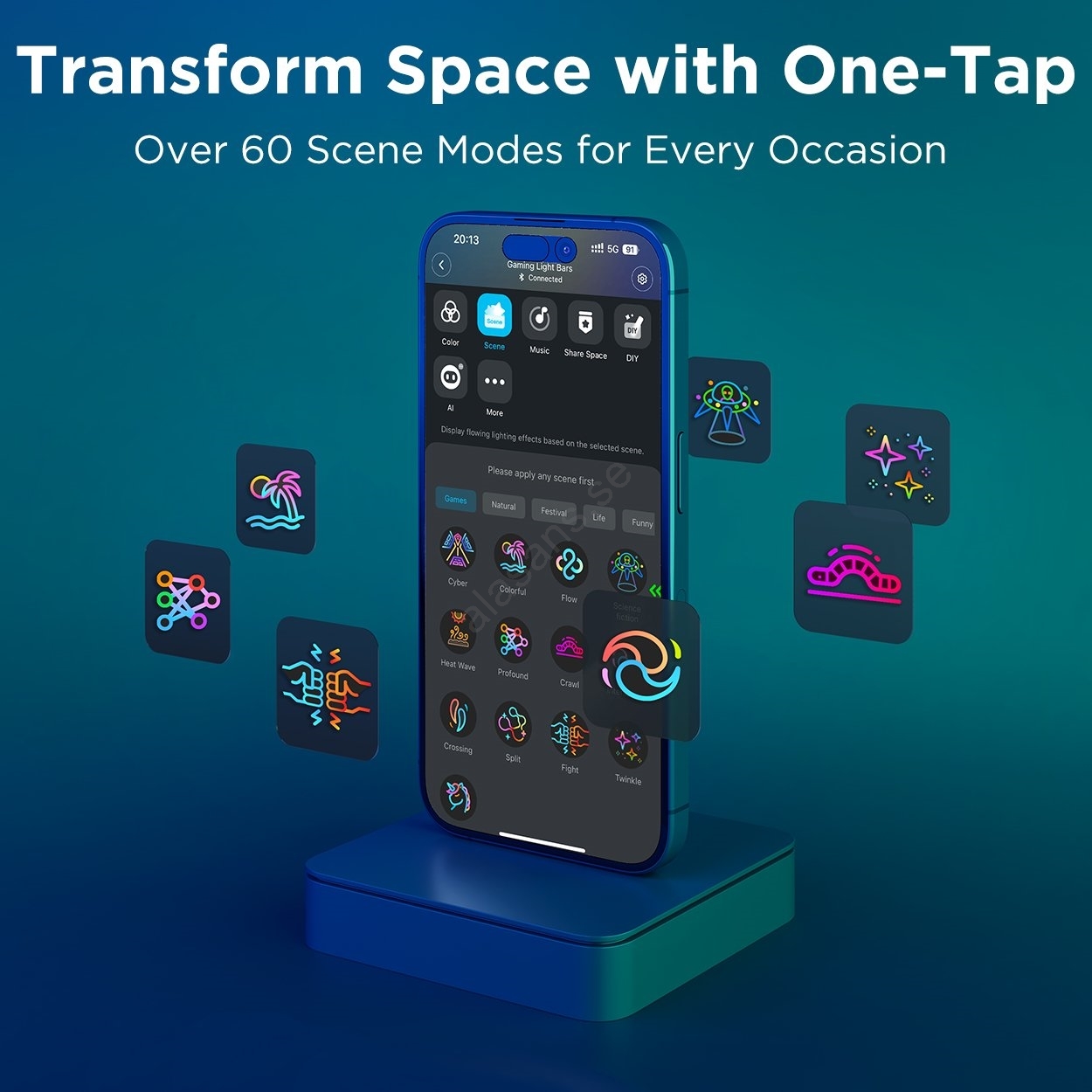 • Musikläge – ljusen reagerar på rytm och ljud och ger liv åt både spel och filmer.