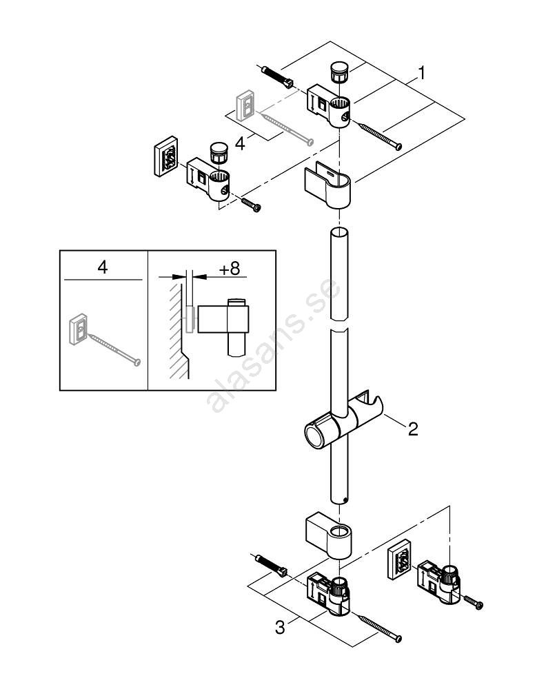 • Kan monteras med skruvar (skruvar och pluggar medföljer) eller limmas (limmet GROHE QuickGlue S 41 247 000 säljs separat; 2 stycken krävs).