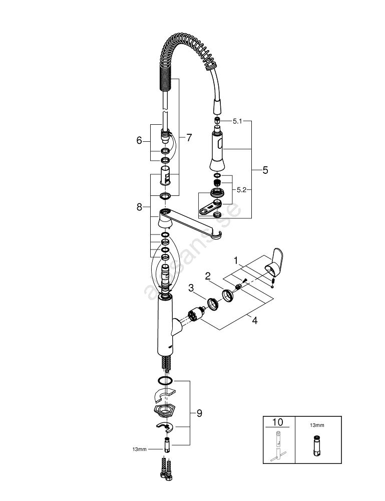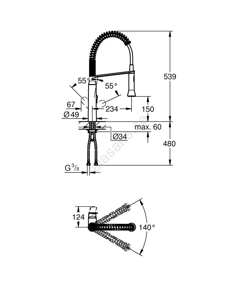 • Svängbar pip med 140° vridvinkel för enkel åtkomst till alla delar av diskhon.