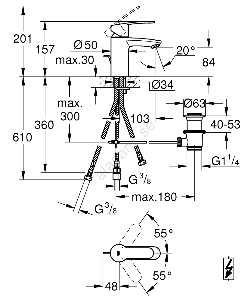 • Variabelt justerbar flödesbegränsare för vattenbesparing.