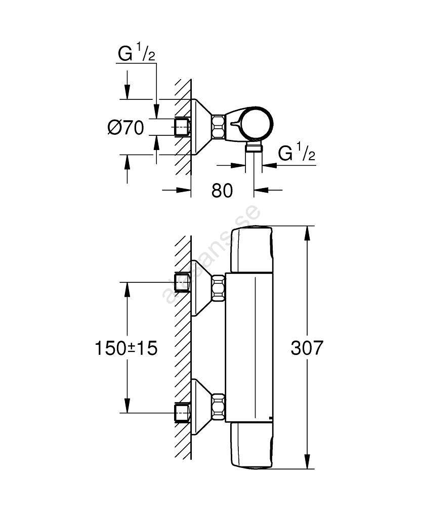 • Väggmonterad termostatisk duschblandare för exakt temperaturreglering.