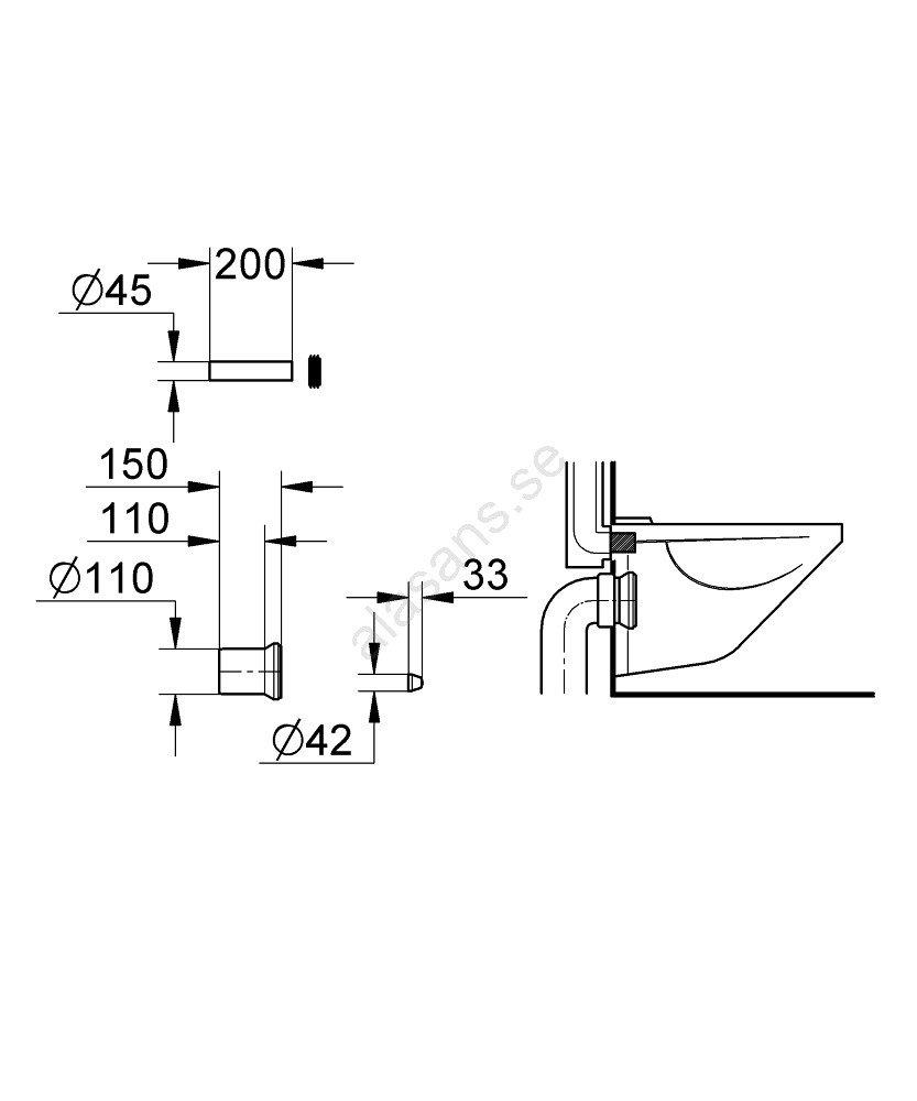 • Anslutningsrör med diameter 45 mm och längd 200 mm.
