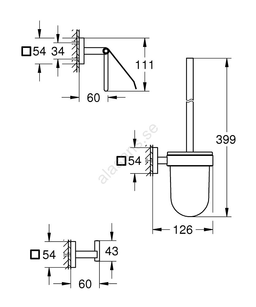 • Setet innehåller krok för badrock, toalettpappershållare och toalettborste.