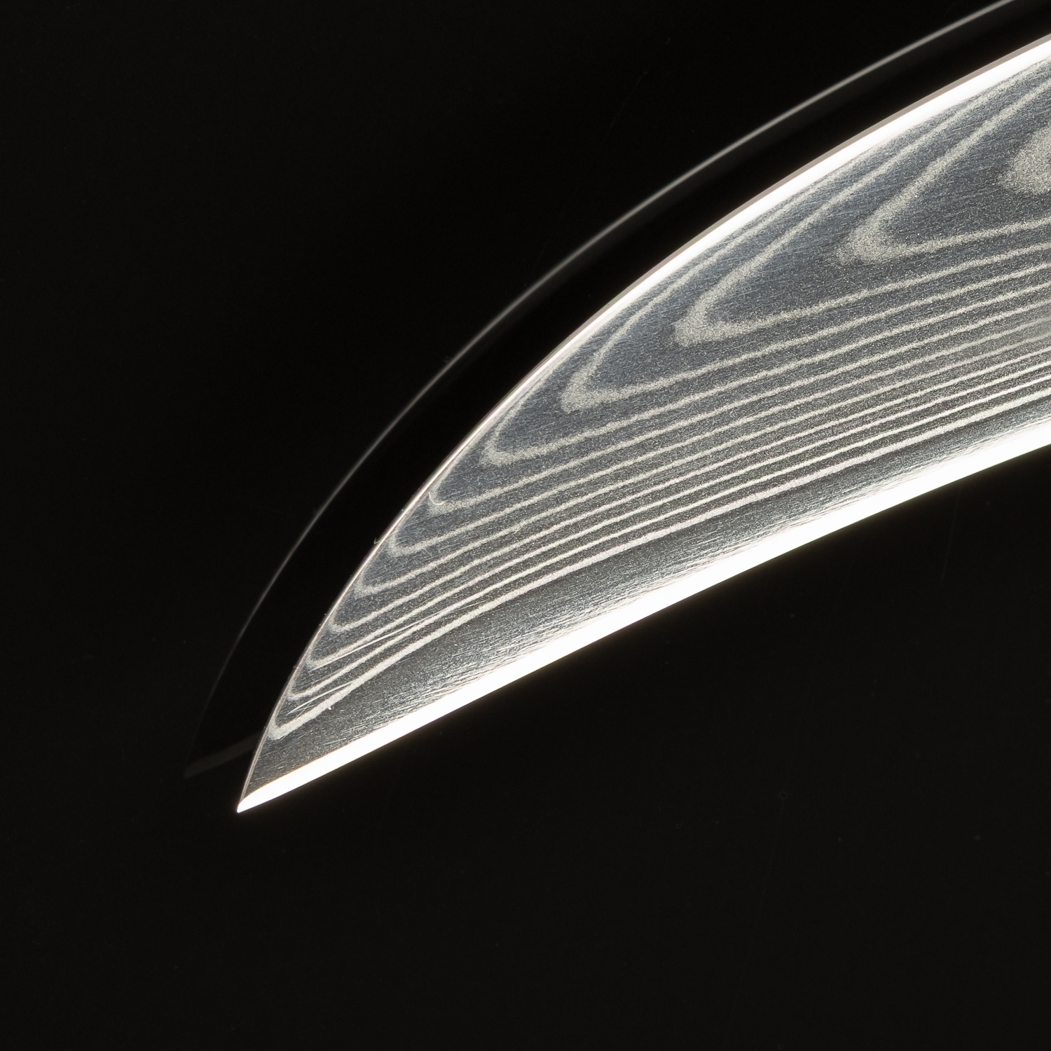 • Klinga med längden 76 mm och bredden 23 mm består av 67 lager av damaskusstål med en VG10-kärna, som ger exceptionell hårdhet och slitstyrka.