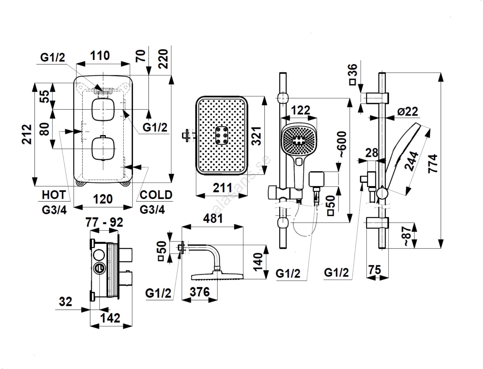 • Förpackningen innehåller: inbyggnadsbox, komplett blandare, duscharm, duschplatta med slang, dold skjutbar handdusch.