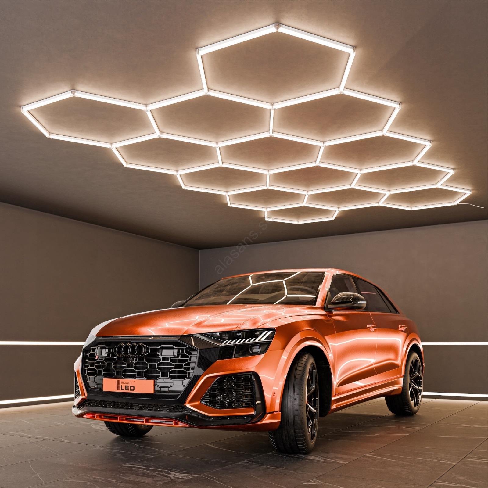 • Tack vare den sexkantiga strukturen fungerar belysningen både som ett estetiskt inslag och som ett funktionellt ljussystem.
