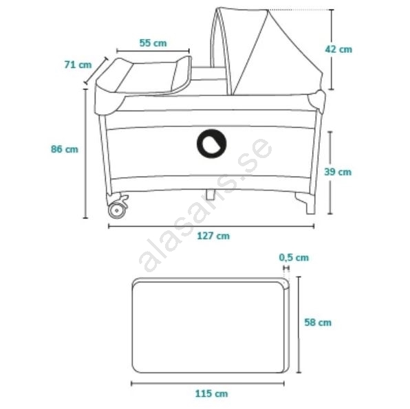 • Ingår: skötbord med sidofickor (för blöjor, puder m.m.), tillbehörskorg med två fack, stor myggnät, sufflett och leksaksbåge med plyschleksaker.