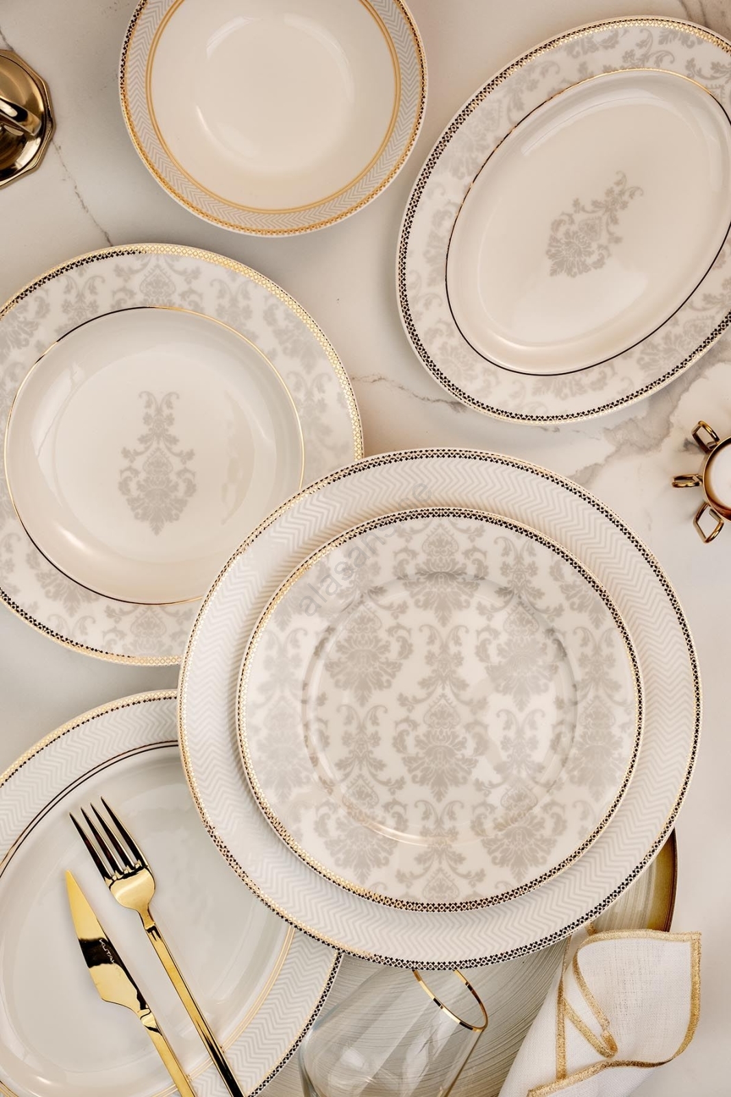 • Tillverkad i benporslin (sammansättning: kaolin, kvarts, fältspat, benaska 30–45 %), som kännetecknas av exceptionell lätthet, hållbarhet och en fin glans.