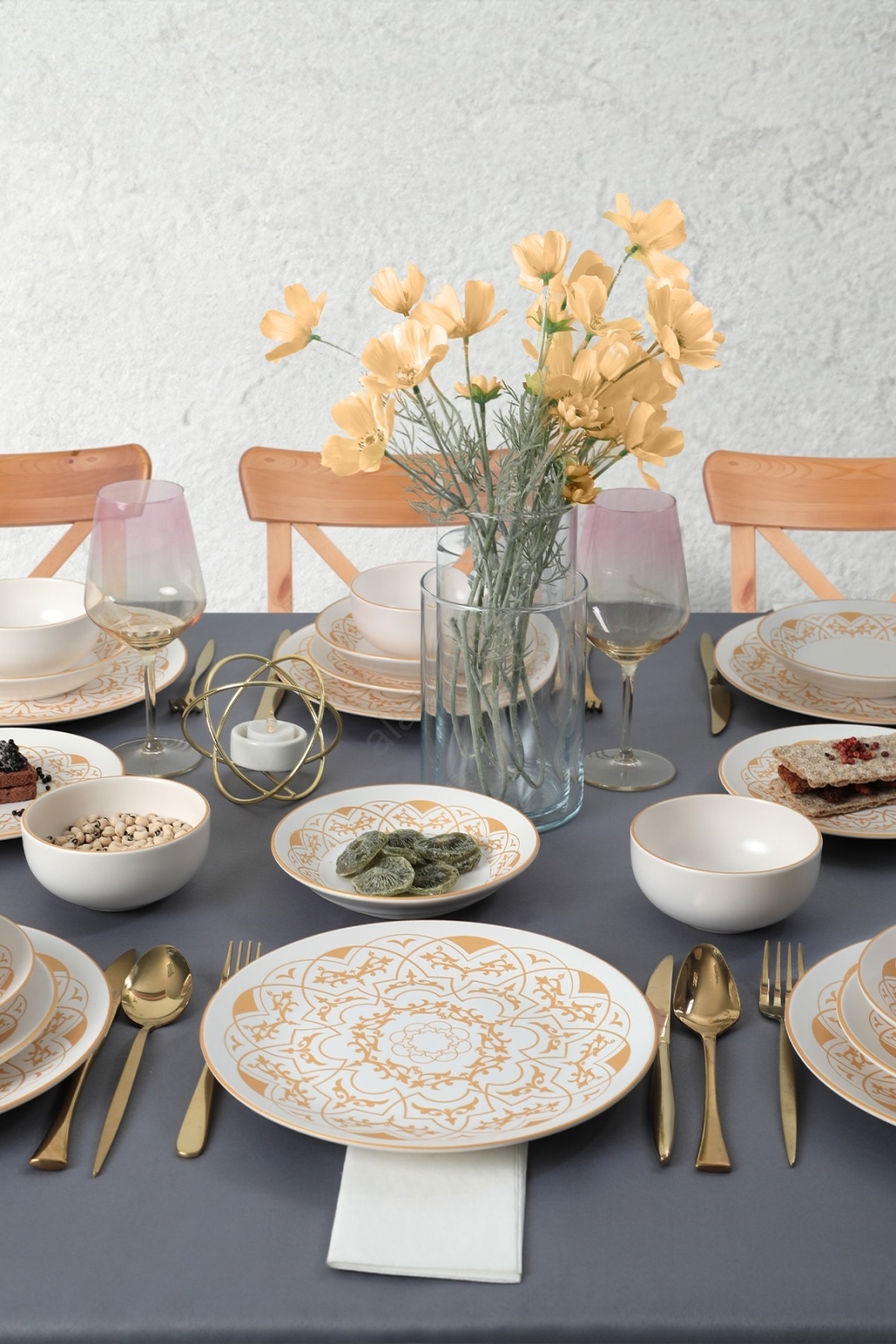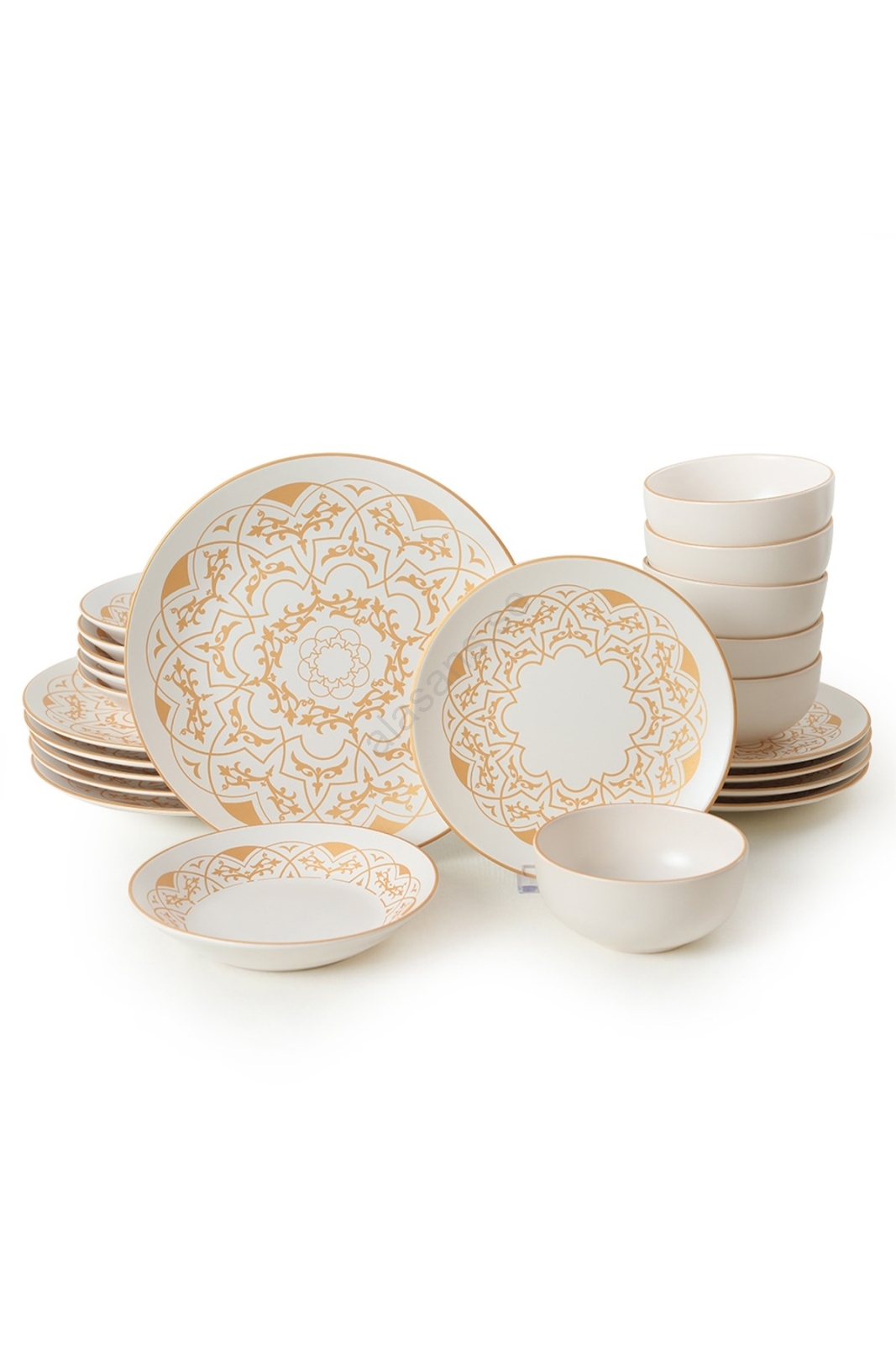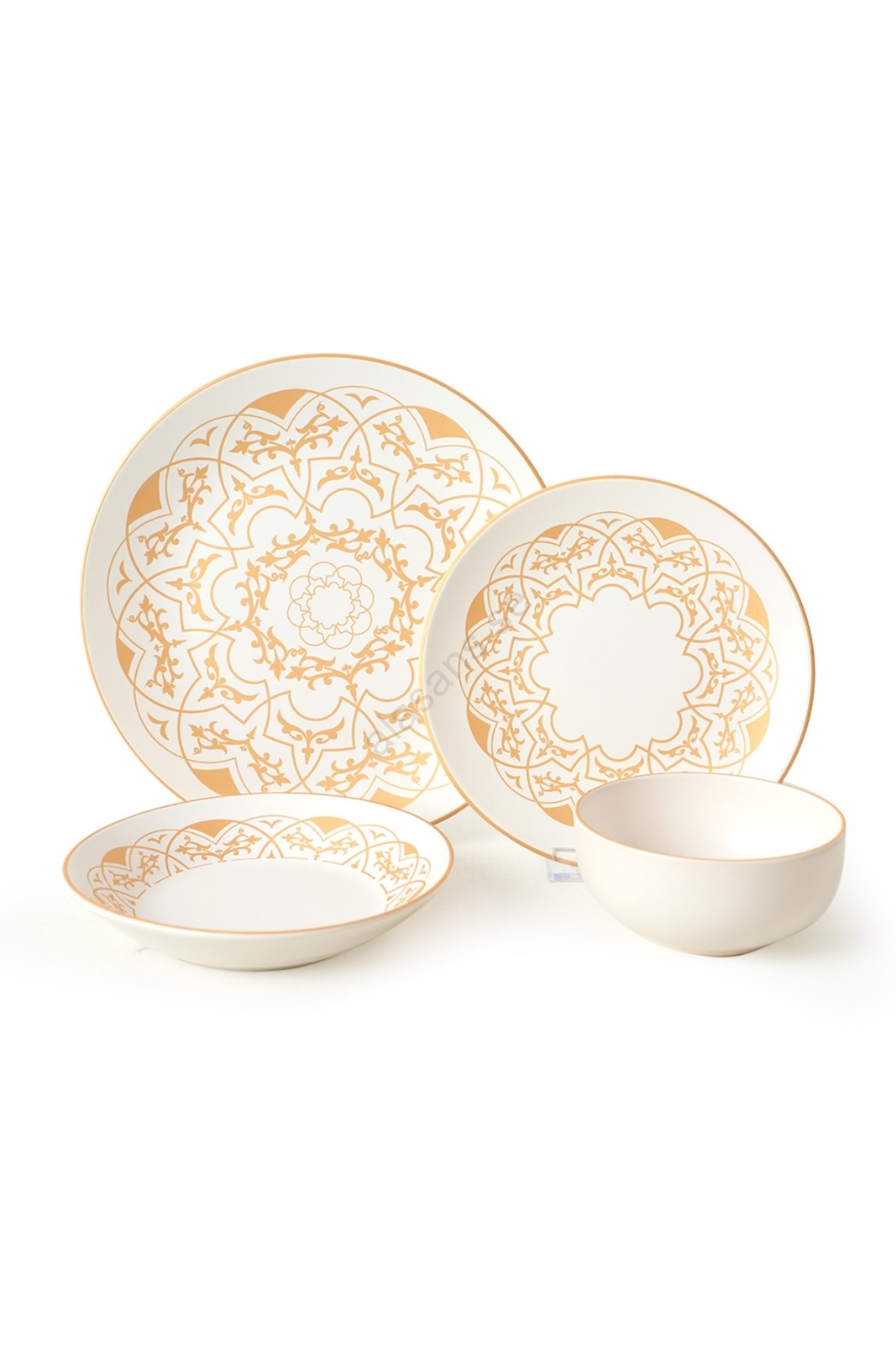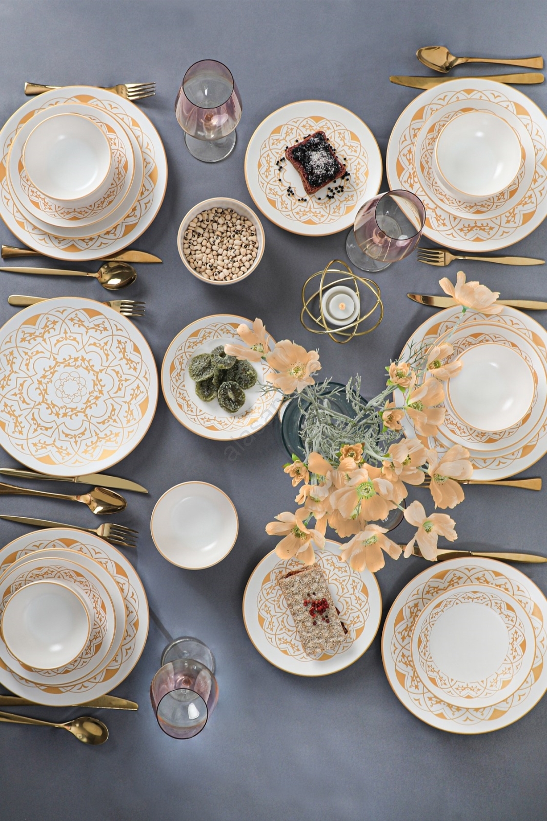 Middagservis i 24 delar – vit med gulddetaljer, i keramik | Alasans
