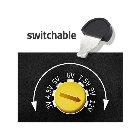 • Tack vare en vridbar spänningsväljare för utgångsspänningen kan du enkelt ställa in önskat värde i intervallet 3 till 12 V DC, vilket säkerställer kompatibilitet med olika typer av enheter.