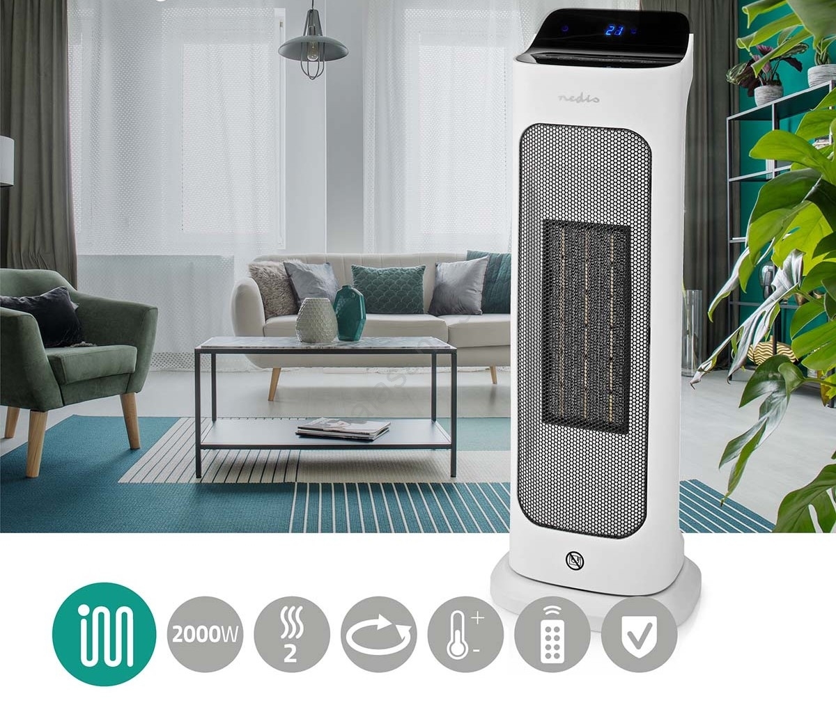 Nedis HTFA20WT - Fläkt med keramisk värmeelement 1400/2000W/230V + fjärrkontroll | Alasans