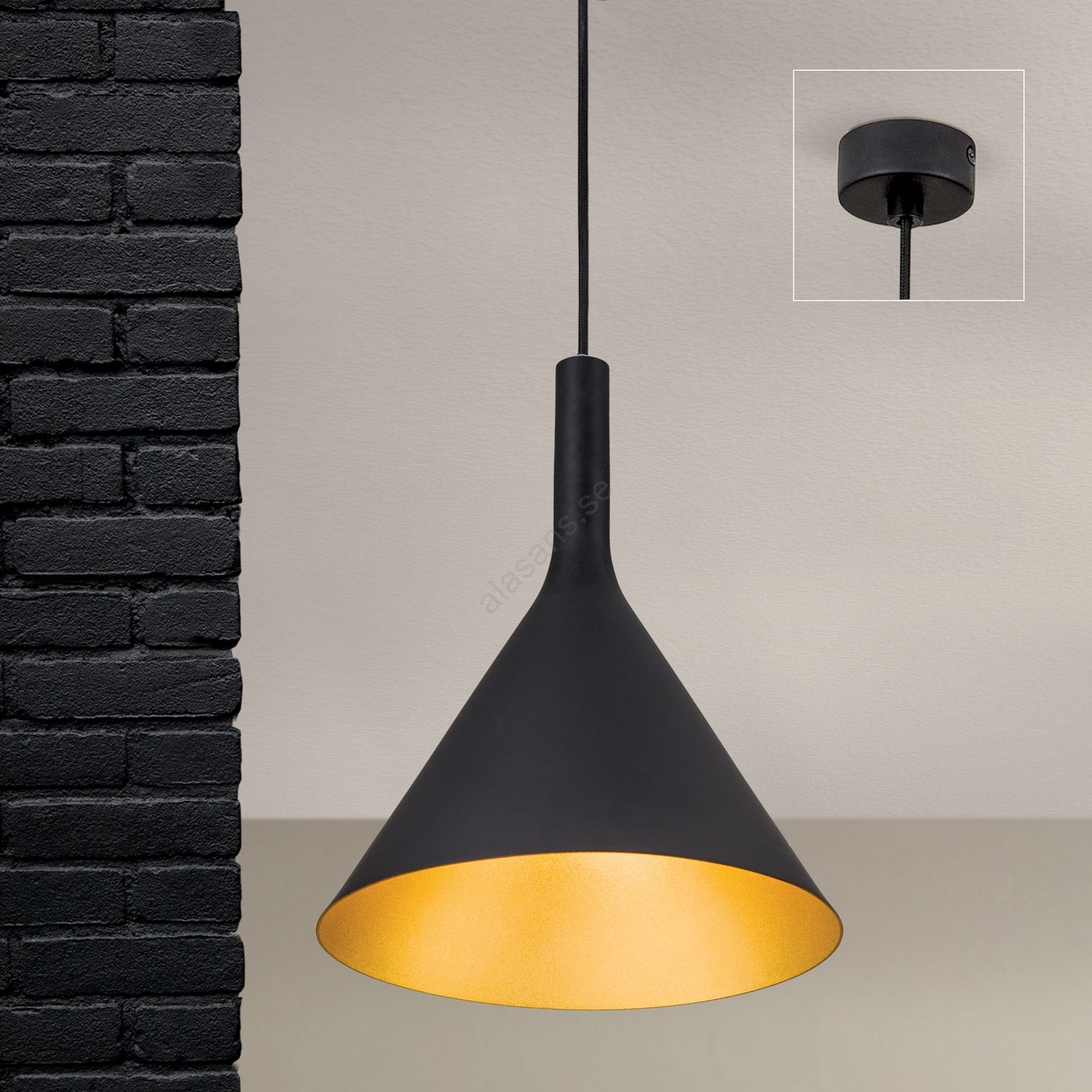 Hänglampa med kabel GUNDA 1xE27/60W/230V Ø 25 cm svart/guld kännetecknar snygg och funktionell design. En glödlampa med E27 lock är lämplig för lampan. Här kan du köpa andra glödlampor till förmånliga priser. Du kommer att få ett intressant tillägg till ditt hem.