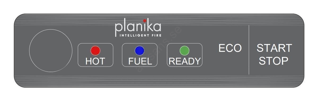 • Kontrollpanelen möjliggör manuell på- och avstängning, växling till ECO-läge och visar när bränsletanken är tom, när eldstaden är redo att startas och om den är överhettad.