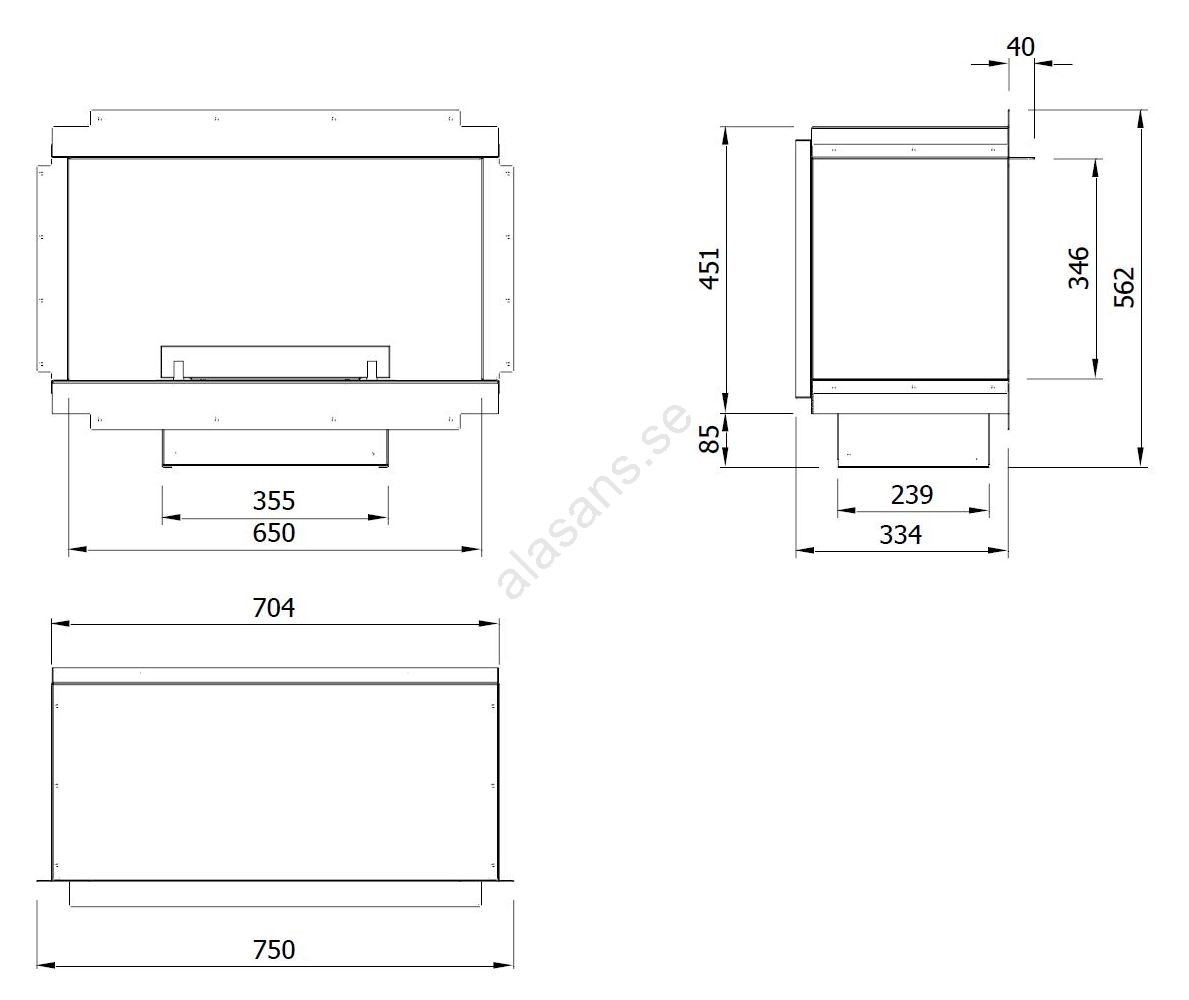 • Mått på eldstaden: 56,2 x 75 x 33,4 cm.