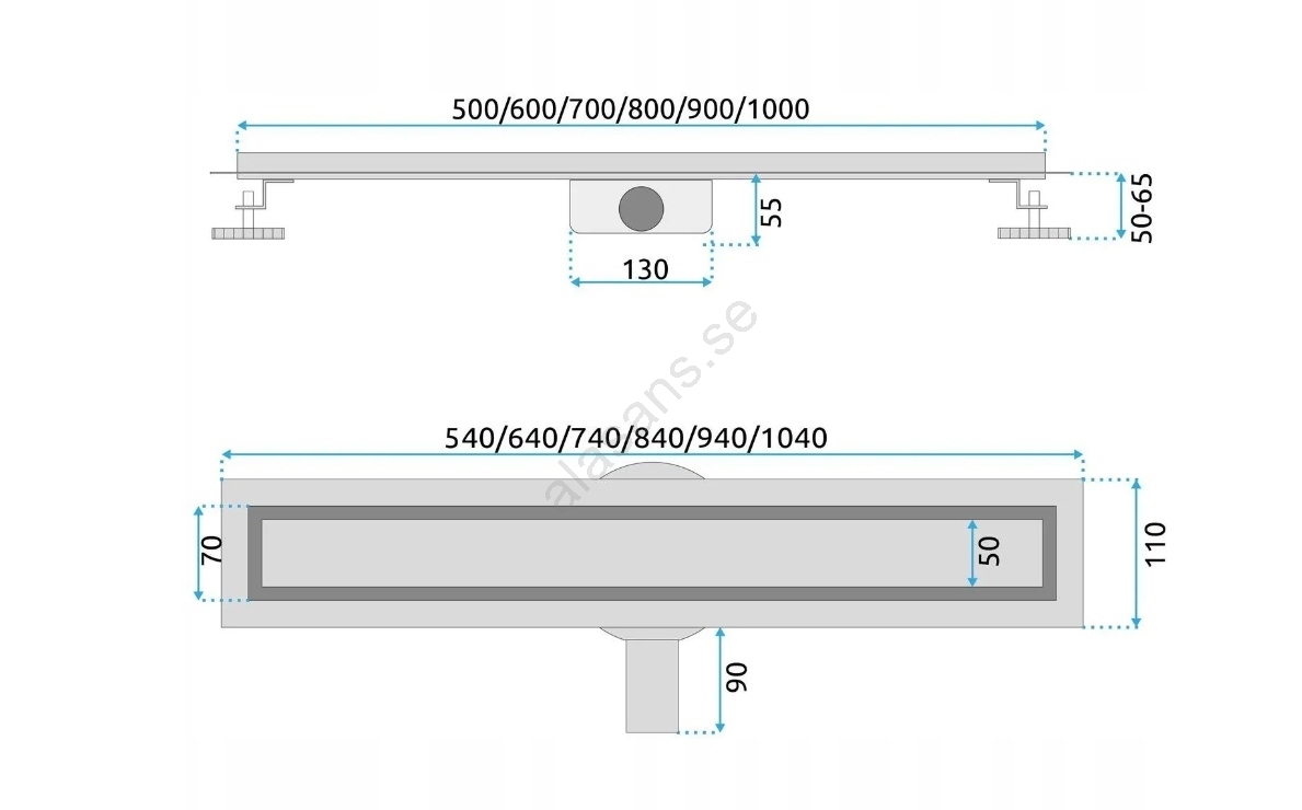 • Tack vare höjdjusterbara ben (50–65 mm) kan avloppet enkelt anpassas till olika golvförhållanden.