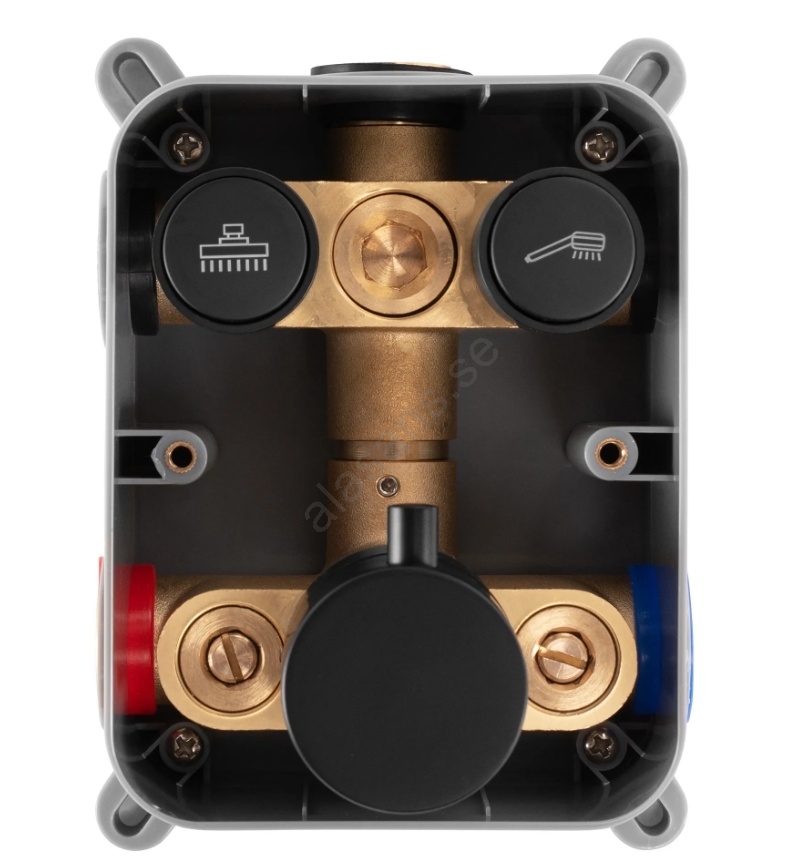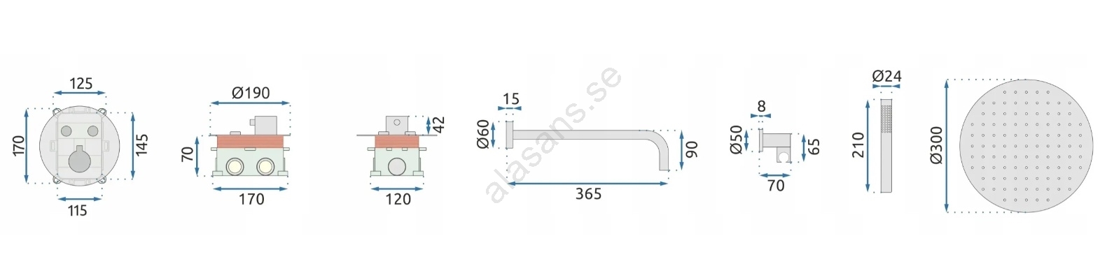 • Förpackningen innehåller: inbyggnadsbox, komplett blandare, duscharm, handdusch och takdusch, handduschhållare, 150 cm slang.