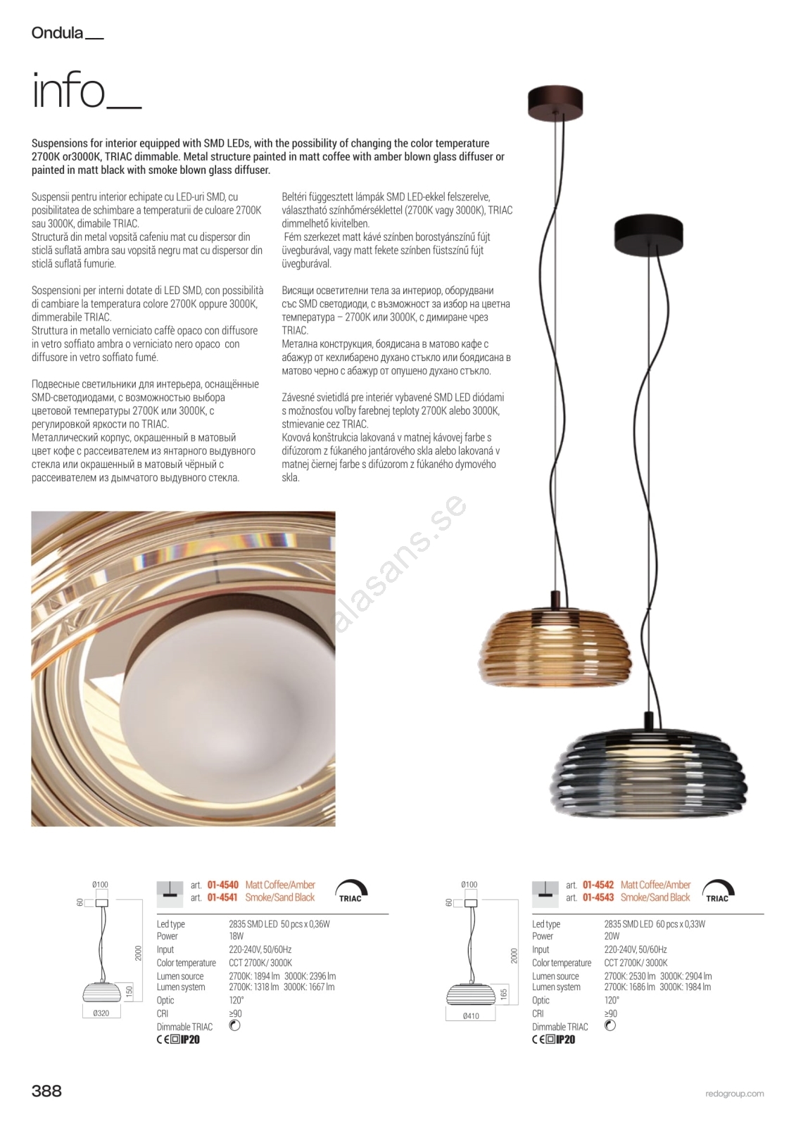 • Redo 01-4540 - ONDULA LED-pendel på vajer, dimbar, 12 W, 230 V, 2700/3000 K, CRI 90, Ø 32 cm, beige/rökfärgad