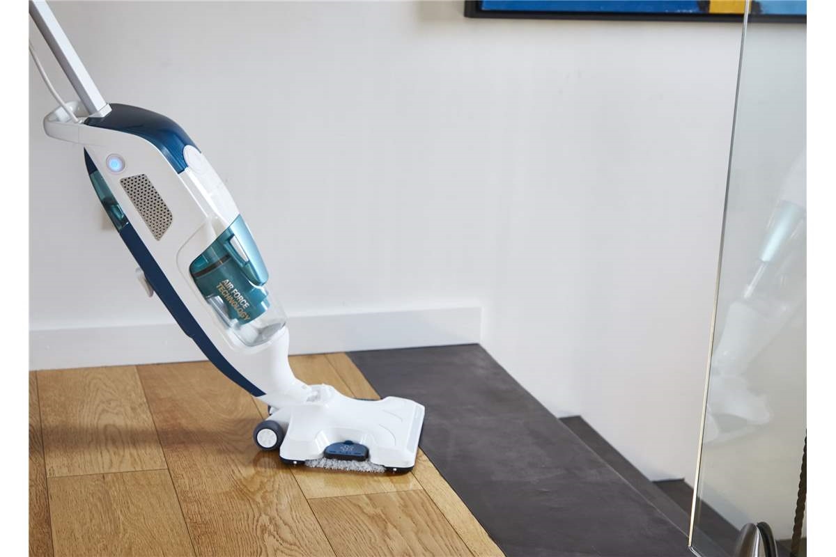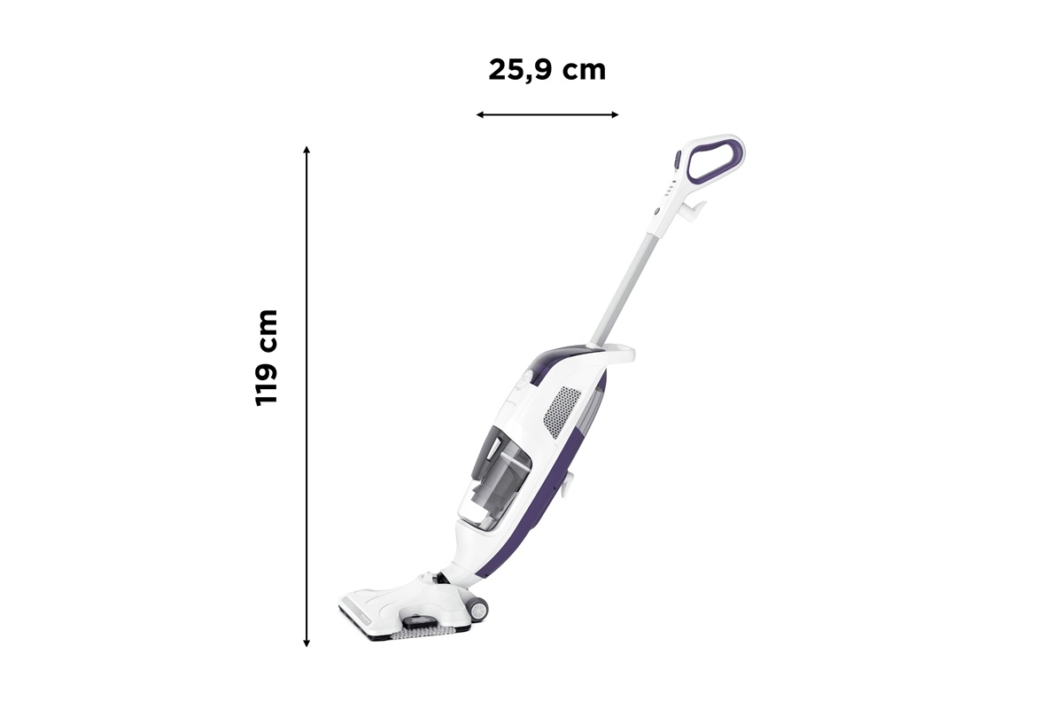 • Multifunktionell 2-i-1-enhet: stående dammsugare och ångmopp — du dammsuger och moppar golvet i ett enda drag.