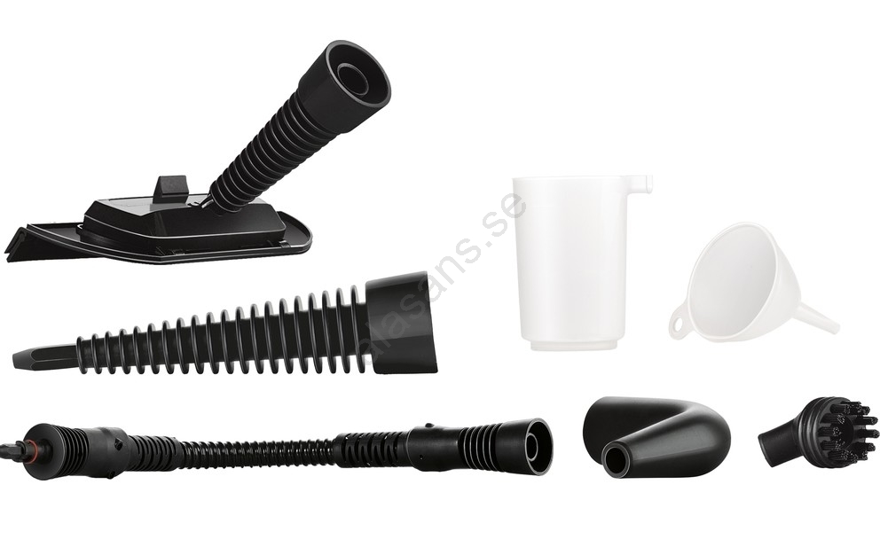 • Tillbehör: grundläggande rak munstycke, böjt munstycke, flexibel slang, mini-mopp med skyddstyg, rund borste, fönster-/spegelrengörare.