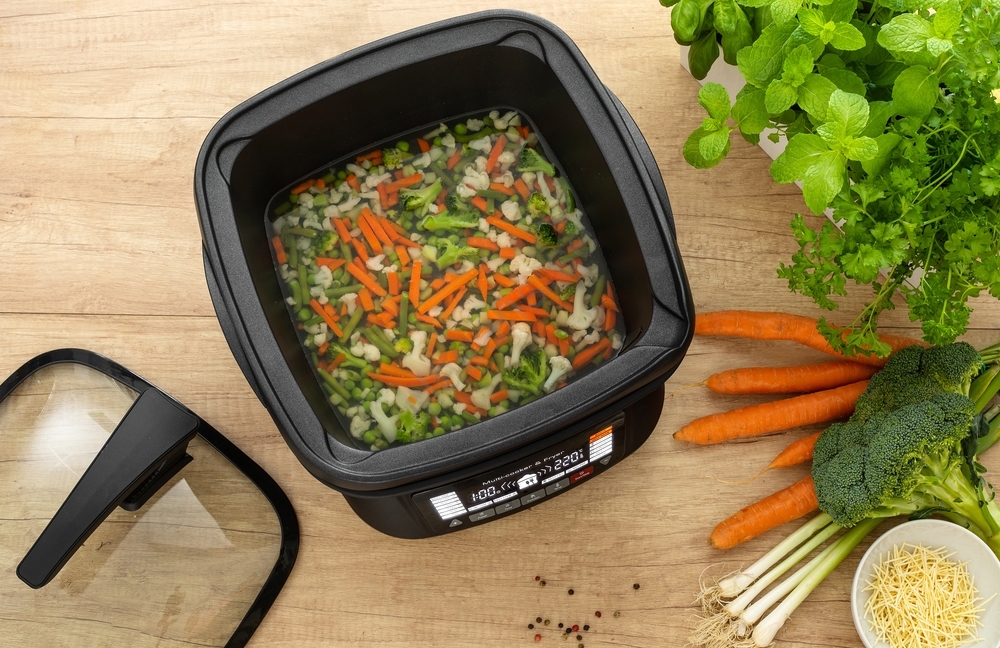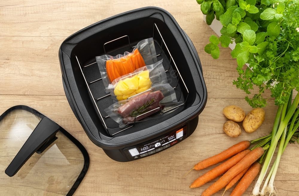 • Funktioner: Sous Vide, snabb bryning, stekning, grillning, bakning, kokning, fritering, långsam tillagning, snabb buljong, fritös, Hot Pot, ångkokning, rislagning, fondue, yoghurt, popcorn, värmehållning, manuell inställning.