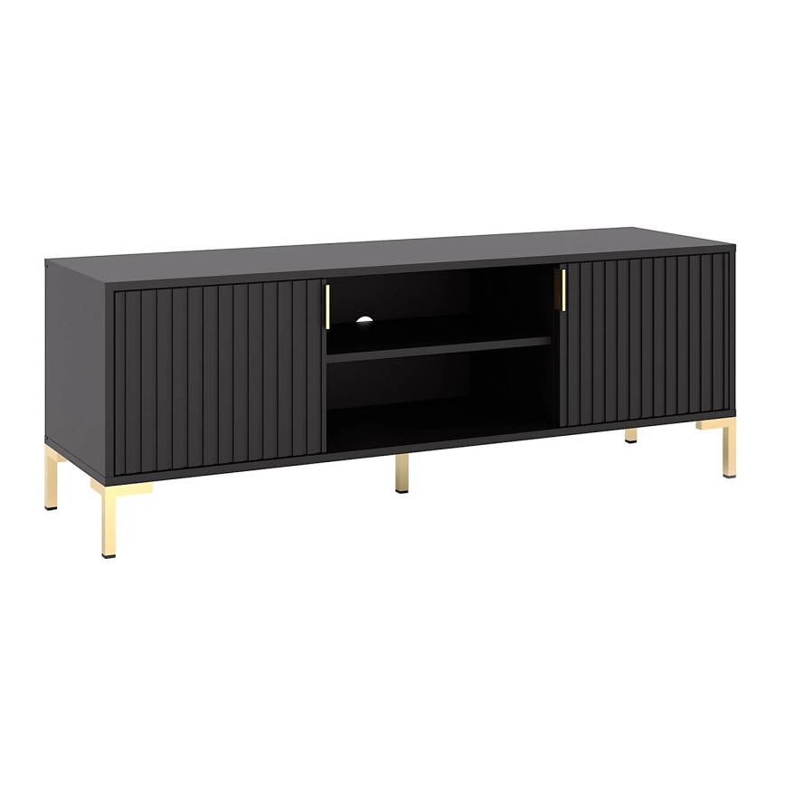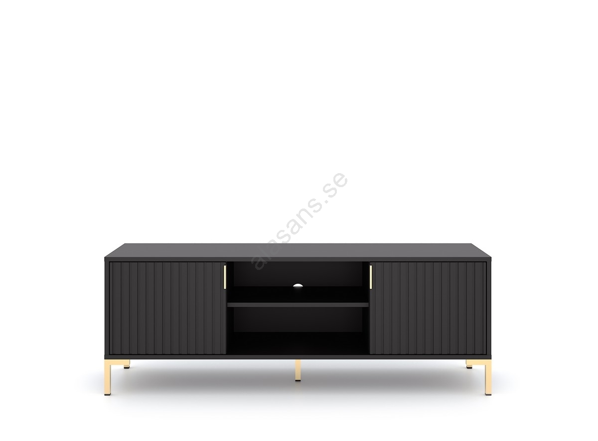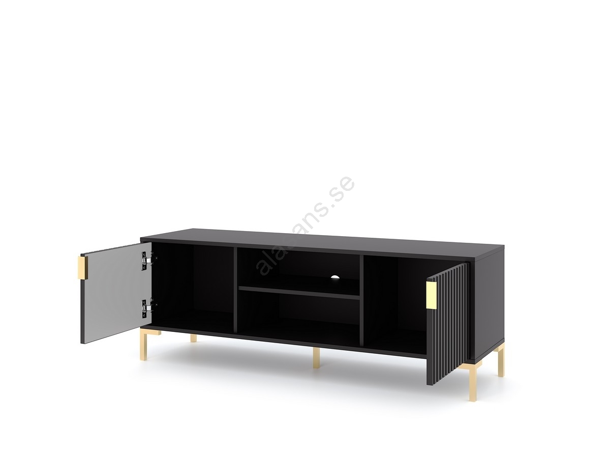 • Den har två slutna sidofack, varje med en dörr med symmetriskt handtag och ribbad yta, samt två öppna hyllor med kabelgenomföring i mitten.