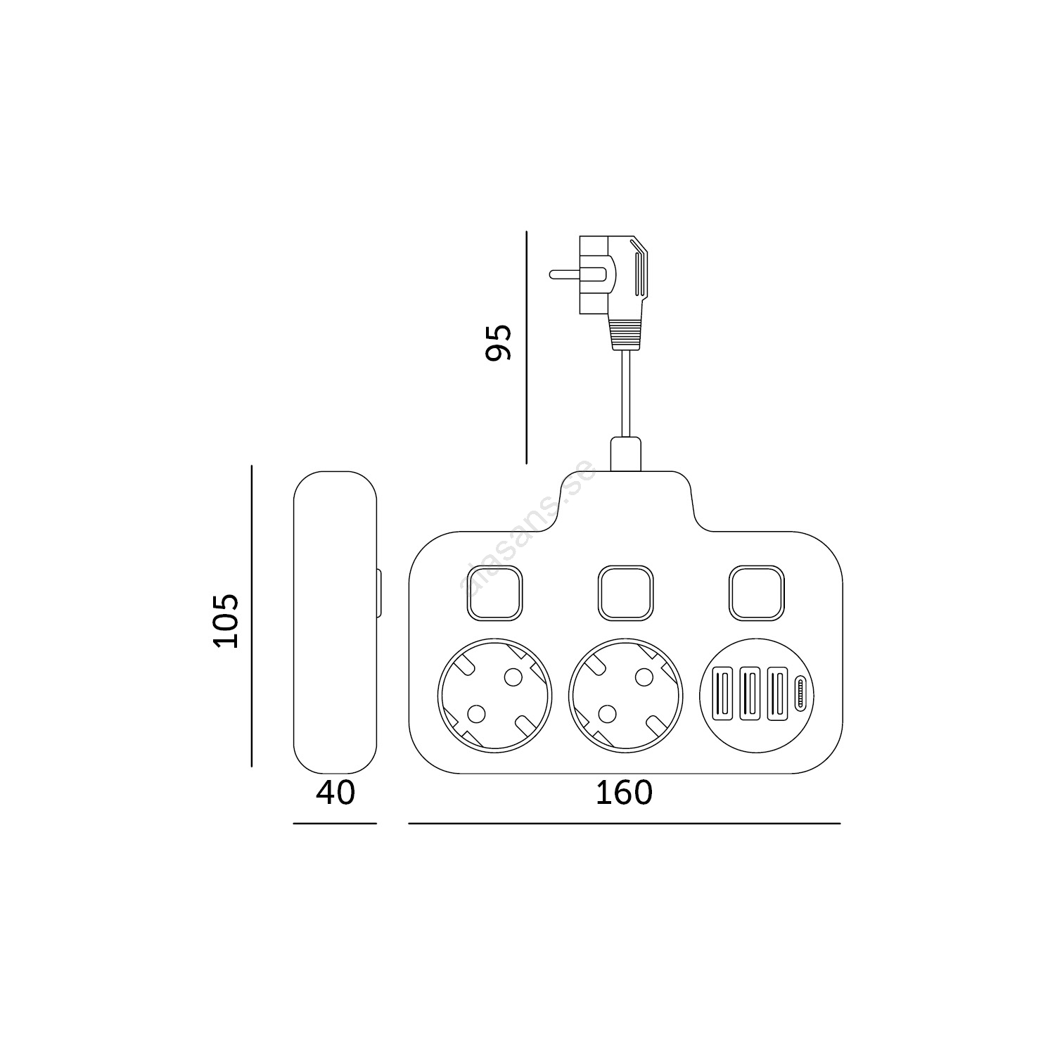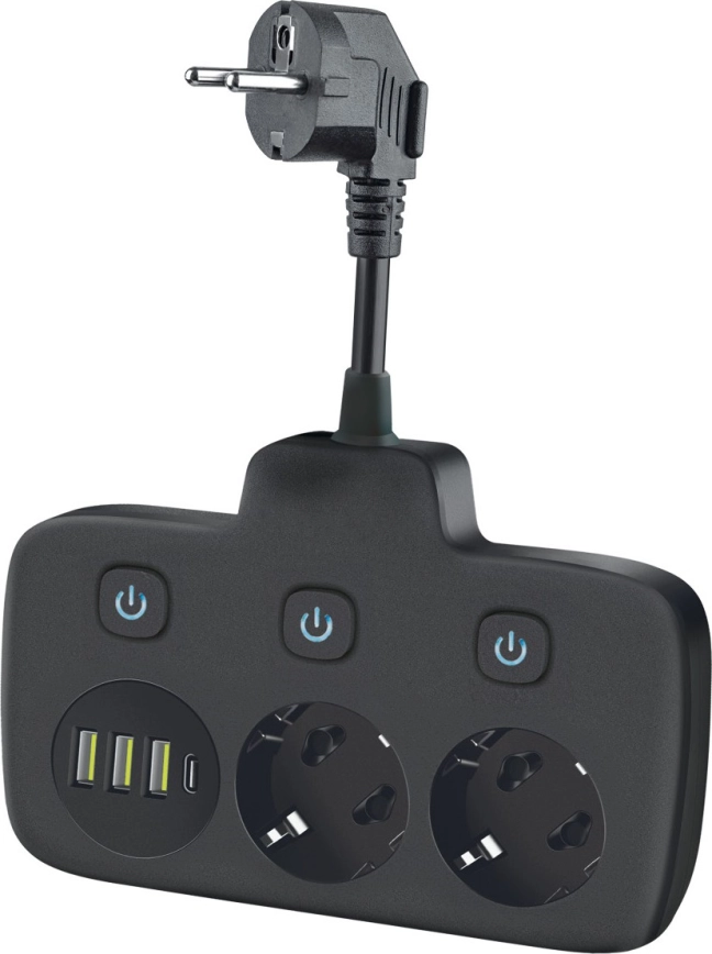 • Antal uttag: 2 x 230 V, 3 x USB-A och 1 x USB-C.