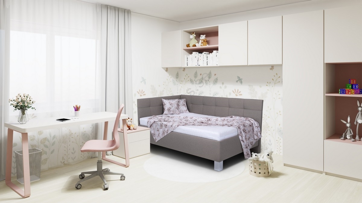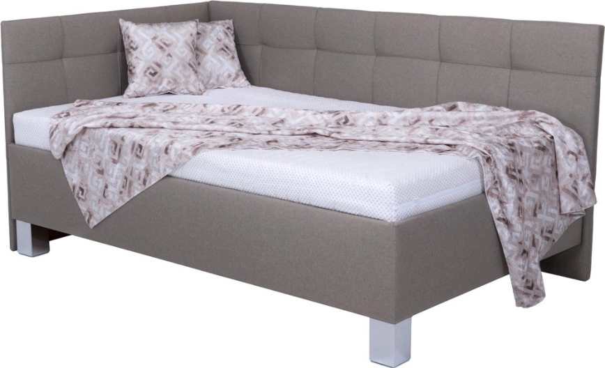 Tygklädd säng MARIA PETITE 120x200 cm med madrass och förvaringsutrymme, taupe | Alasans