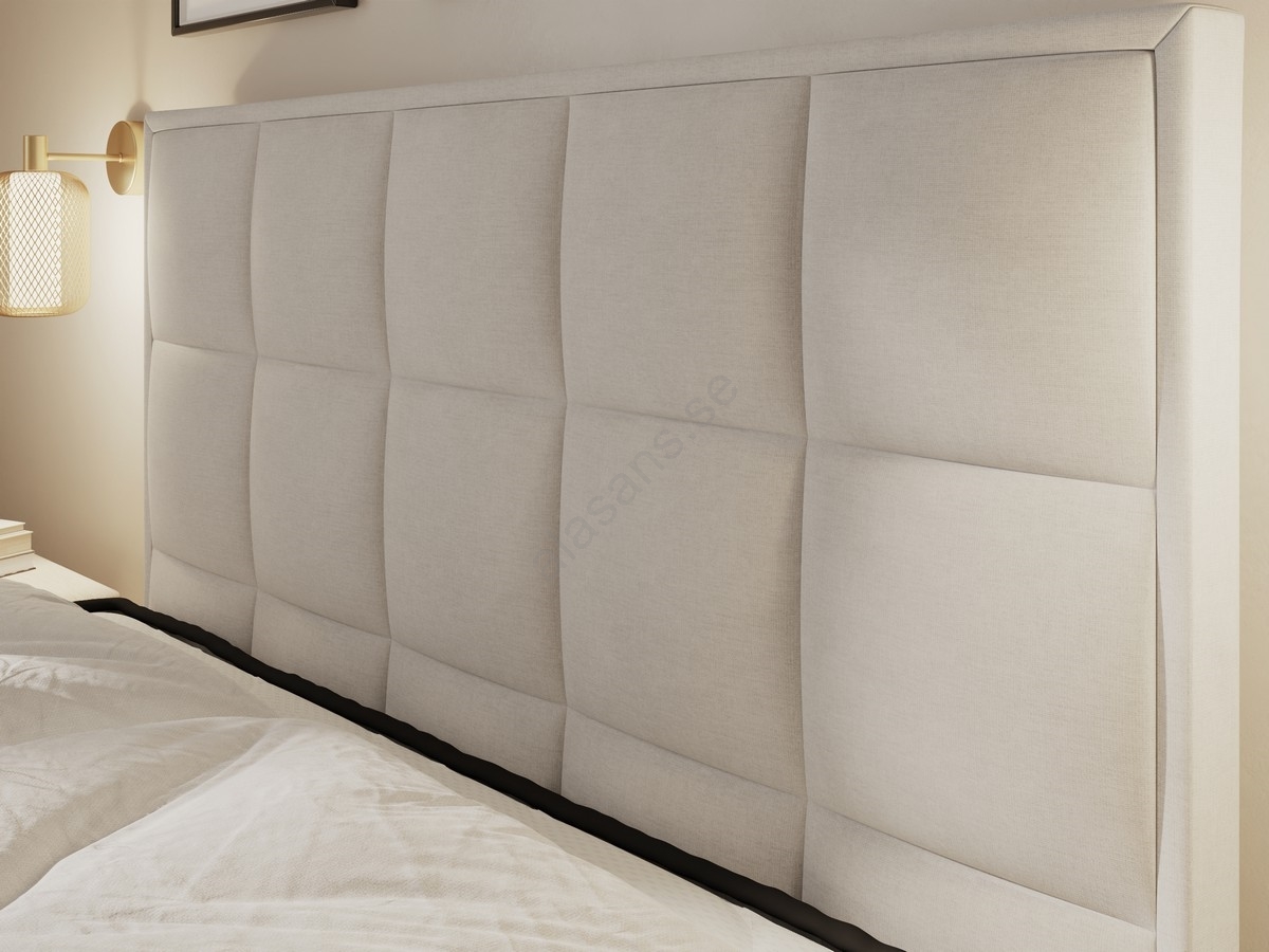 • Tack vare det höga gaveln med fyrkantig quiltning, den fluffiga madrassen och den låga, helklädda ramen upplevs sängen som både mycket ombonad och sofistikerad.