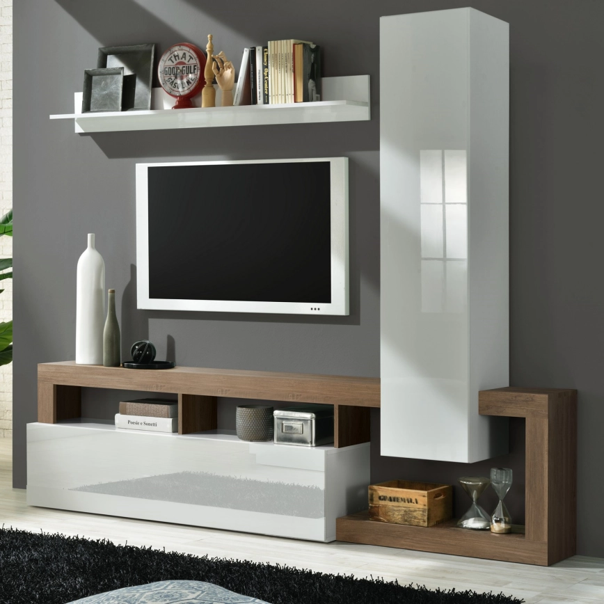 • Den inkluderar en rymlig TV-bänk med öppna hyllor för medieutrustning och slutna fack för dold förvaring.