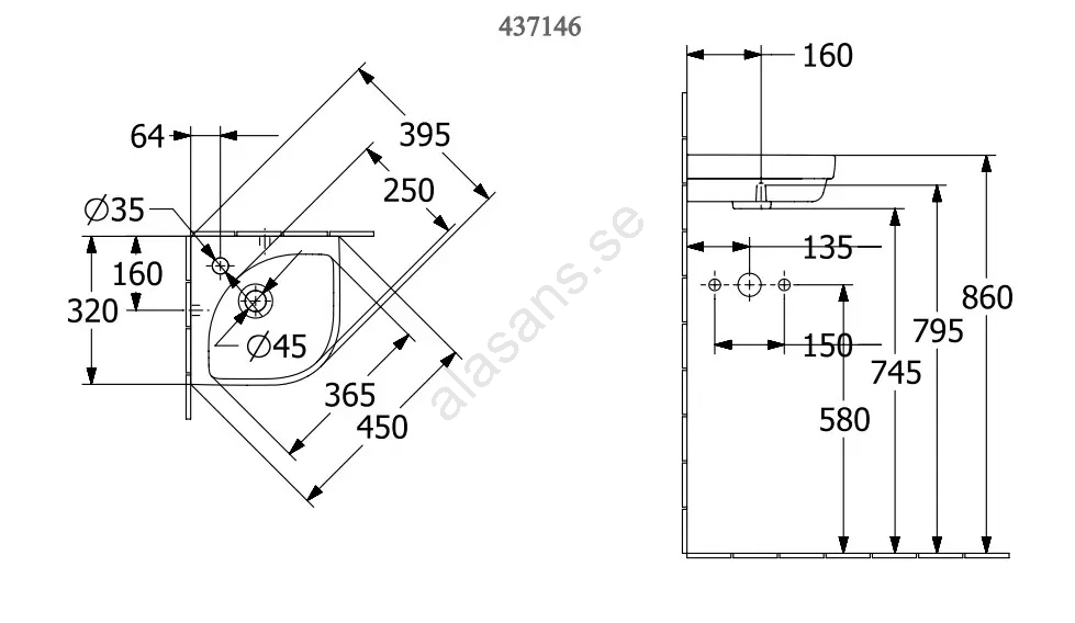 Villeroy & Boch 43714601 - Hörntvättställ, väggmonterat, SUBWAY 32x32 cm, keramik/vit | Alasans