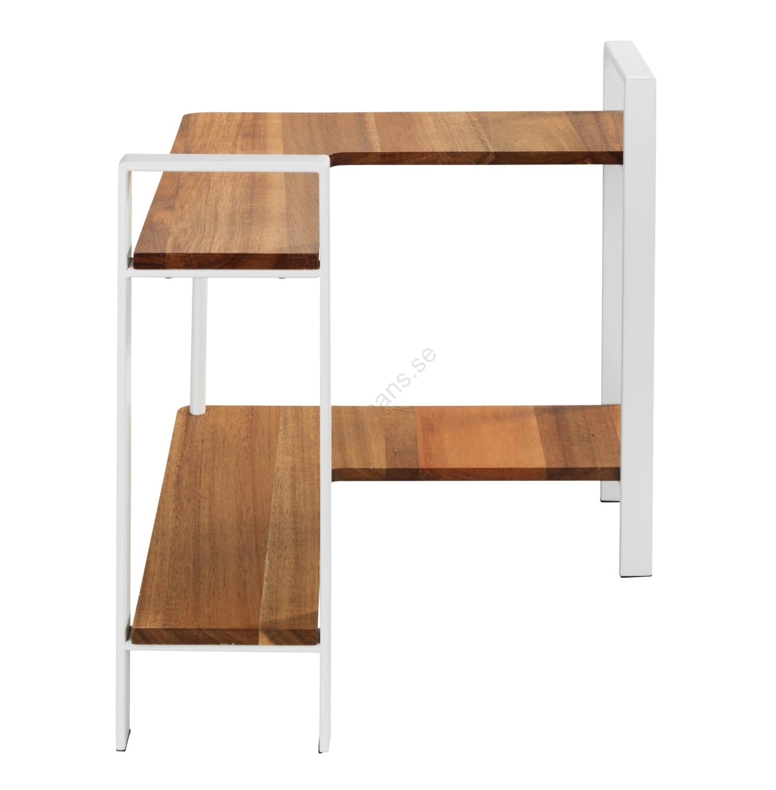 • Elegant kombination av vit metallram och hyllor i akaciaträ.