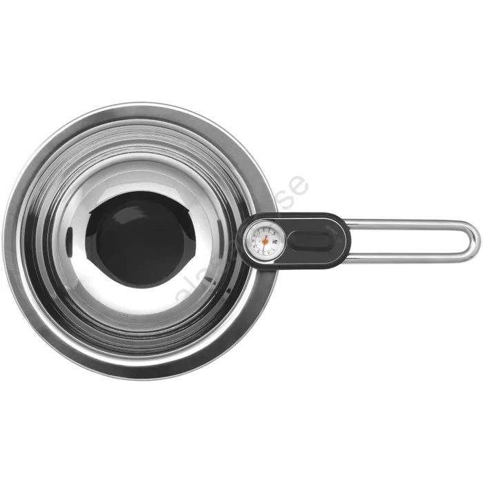 • Integrerad termometer i handtaget/insatsen visar temperatur upp till 100 °C, vilket möjliggör exakt temperaturkontroll utan risk för spill.
